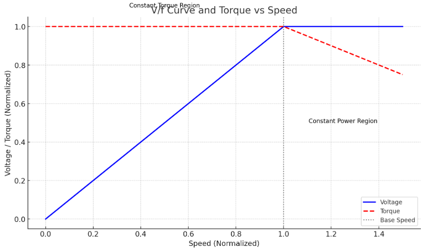 - Constant Torque Region (정토크 영역): 정속도까지는 전압과 주파수가 일정한 비율로 증가하여 일정한 토크를 유지합니다.