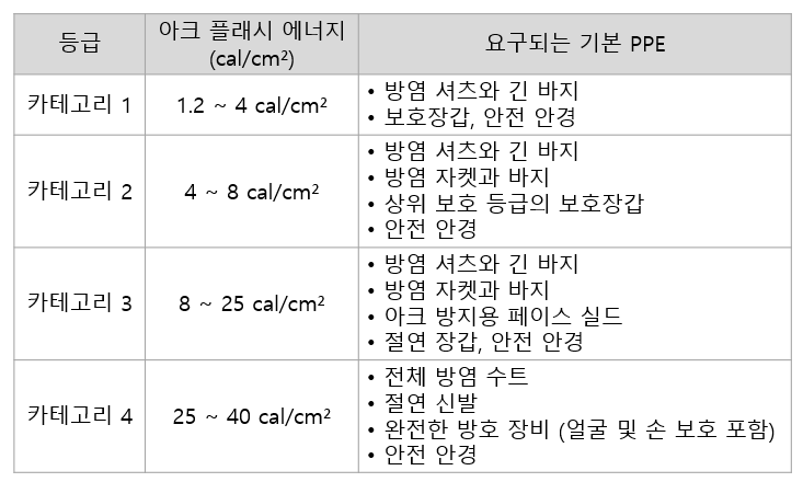 NFPA 70E는 전기 작업의 위험 수준을 네 개의 PPE 카테고리(Arc Flash PPE Category) 로 분류합니다. 이 카테고리는 아크 플래시 에너지를 기준으로 나뉘며, 각 카테고리에 따라 작업자가 착용해야 할 보호 장비의 수준이 결정됩니다.
